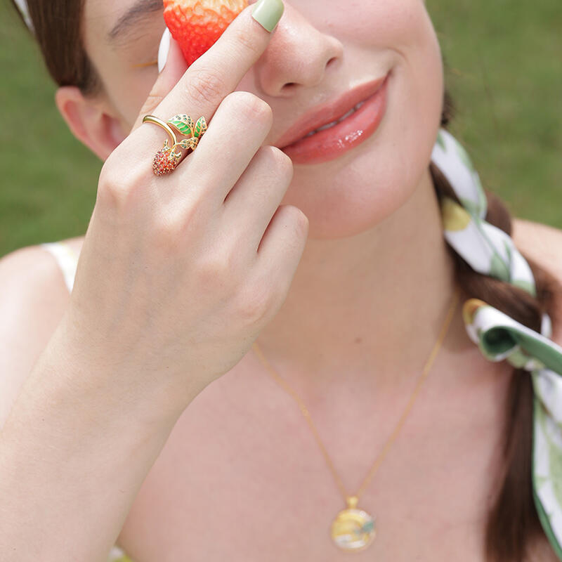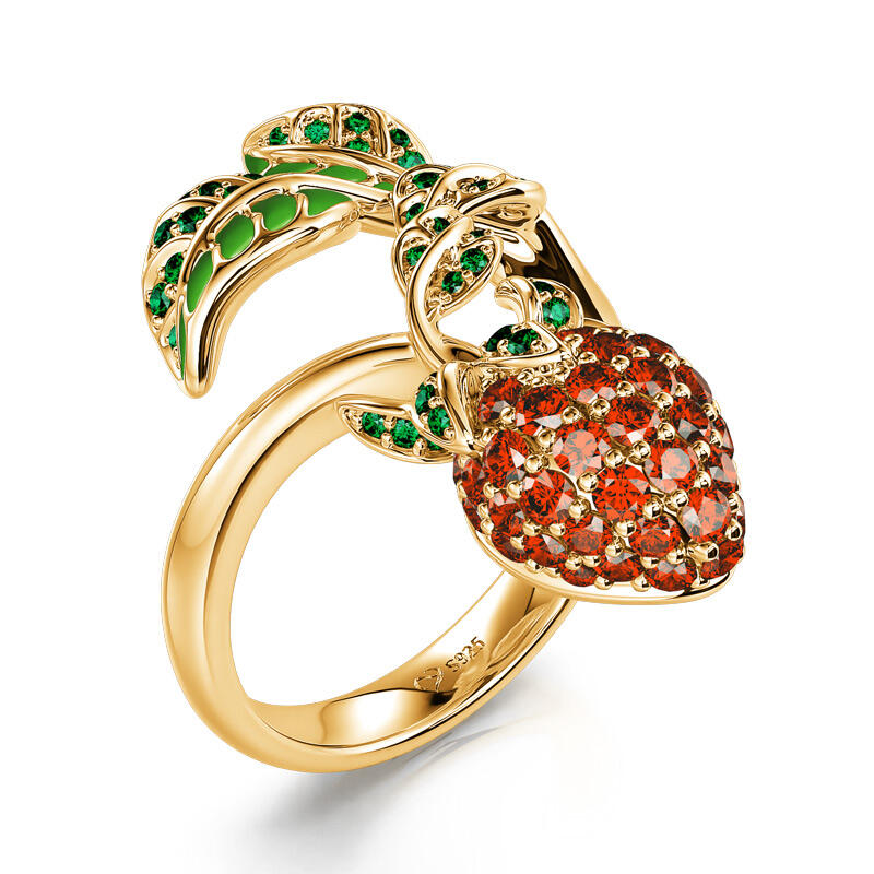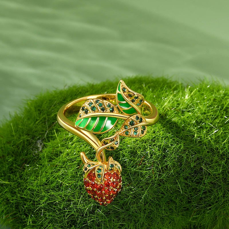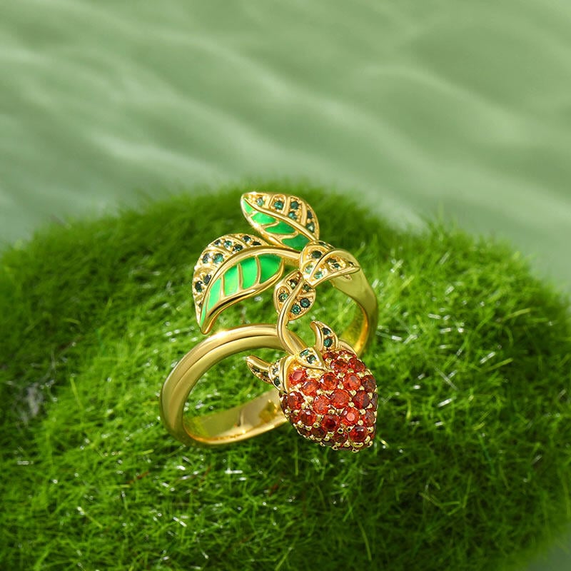 Sweet strawberries are a seasonal staple and what better way to celebrate its beauty than with this sweet strawberry ring? Fresh, colourful and richly graphic, fashion takes a fruity edge with this strawberry ring! Crafted in sterling silver, it features a few leaves and a red strawberry. Thoughtful use of red and green stones creates a realistic look, and the bright color makes this sweet strawberry ring shine. This piece of jewellery brings a good mood to any outfit and offers countless combination possibilities.