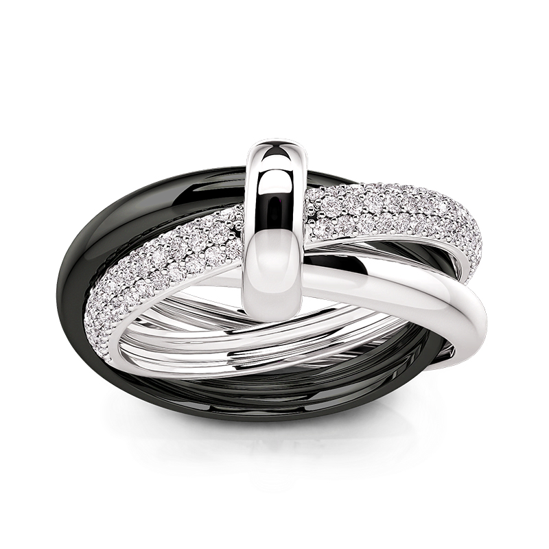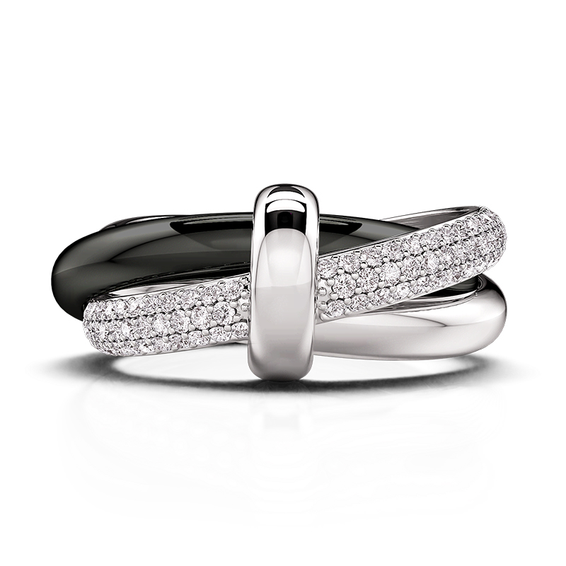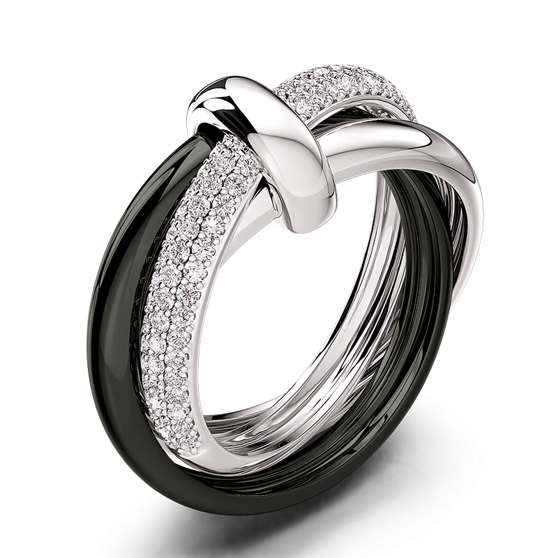 The Jeulia Classic Trinity Ring features three interlocked bands: a matte black oxidized silver band, a polished platinum-plated band, and a pavé river of white stones bridging the two. The stones cluster where the rings converge, their sparkle sharp as starlight piercing midnight fog. No hierarchy—each strand holds equal weight, a manifesto for love that thrives in tension. Slender yet substantial, it anchors vows while remaining easy to forget until light catches the contrast.