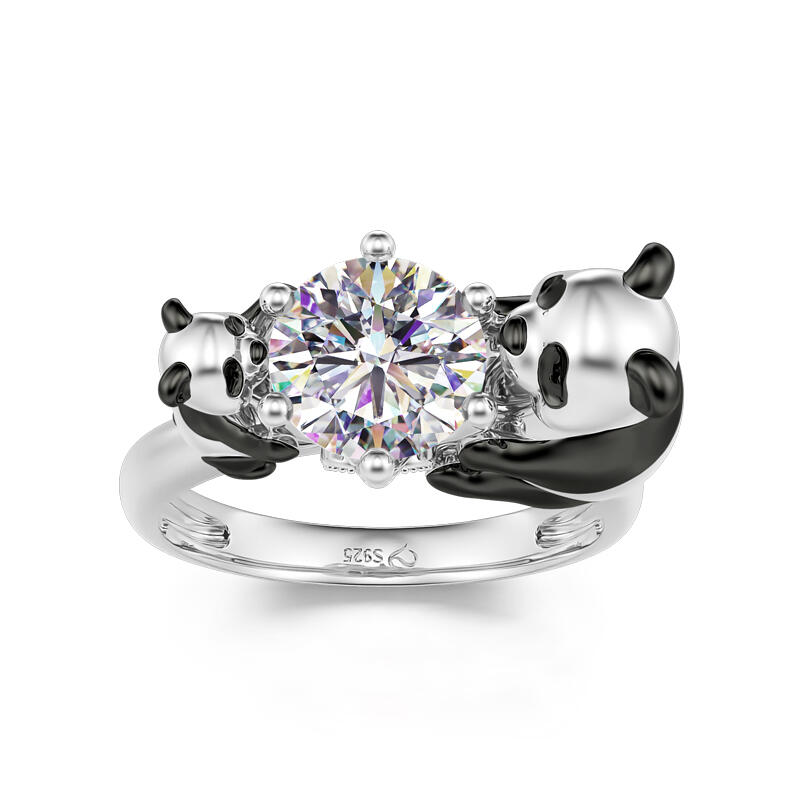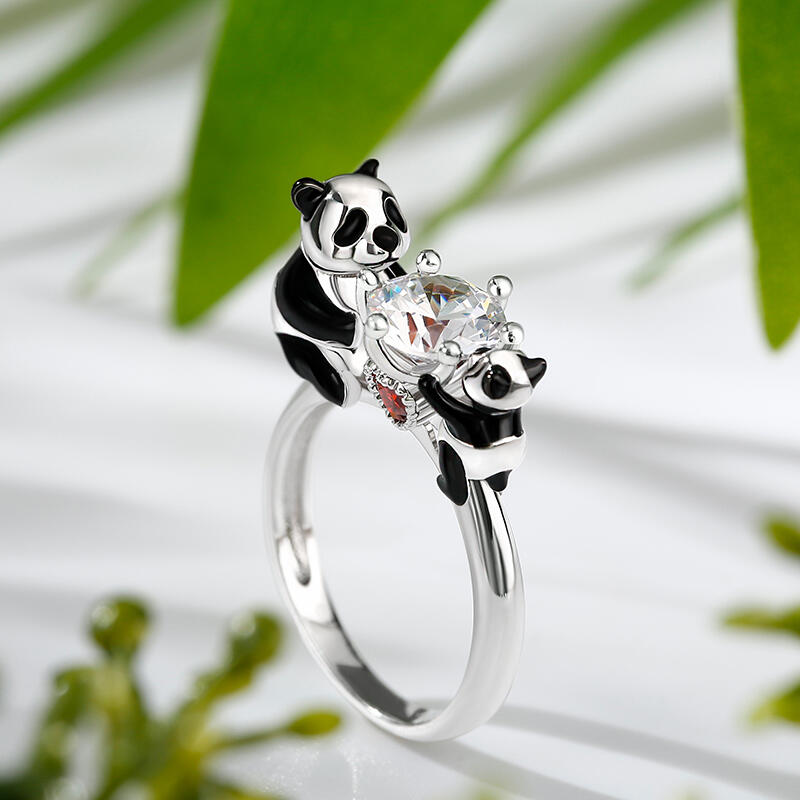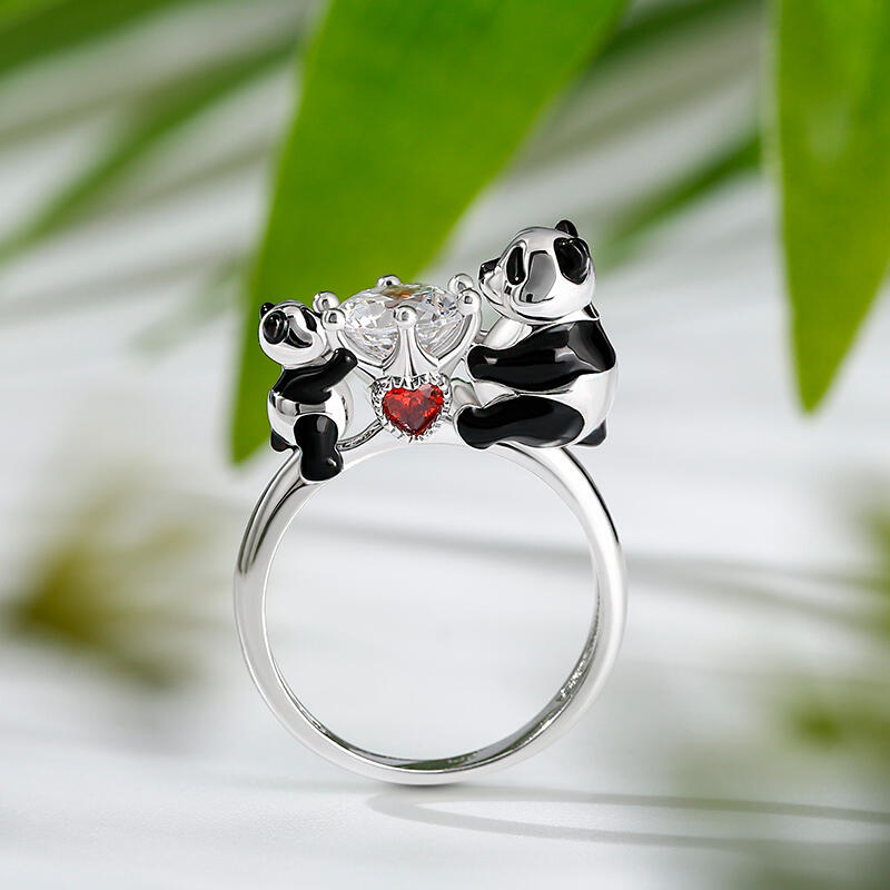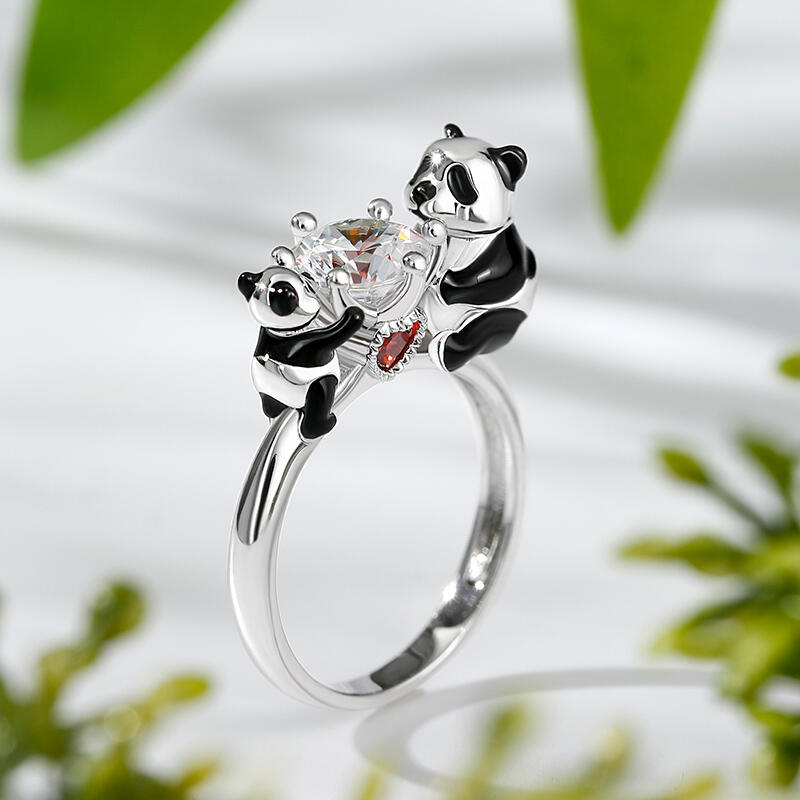 Jeulia Hug Me "Powerful Love" Mom and Baby Panda Round Cut Sterling Silver Ring