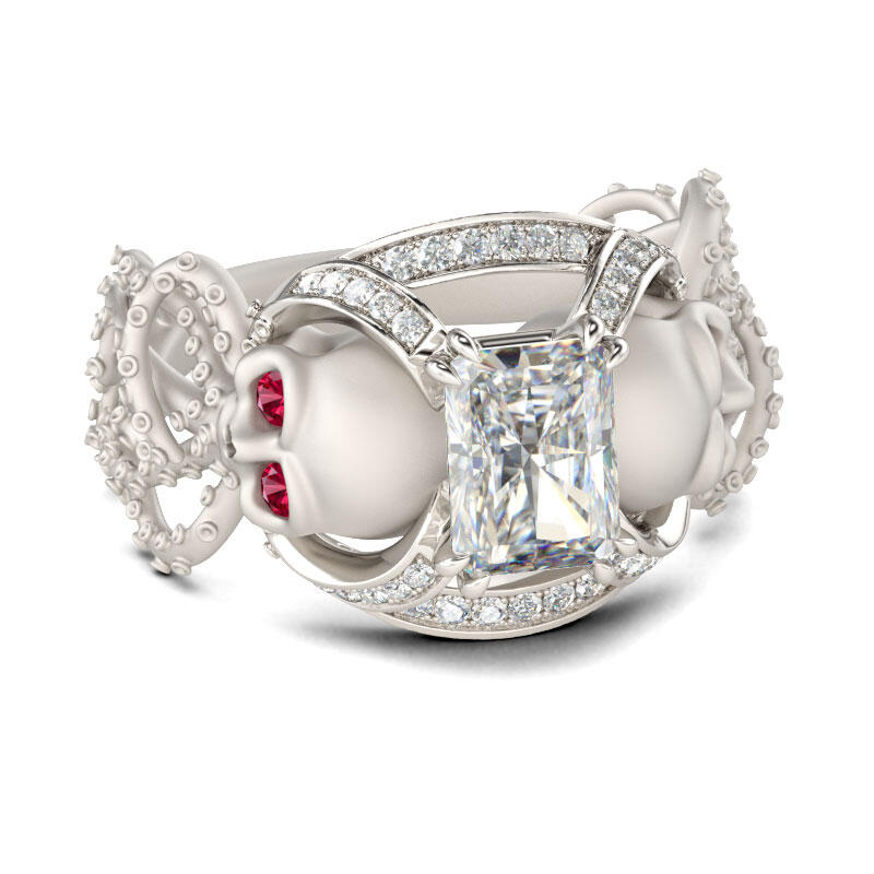 What a cool ring! The design is a combination of skull and octopus. Two octopi joint to make the band of the ring and four ruby red stones are set as eyes of octopi. A radiant-cut center stone is above the octopi, adding spark to the ring. It's a good choice for people who are looking for special jewelry. Mark yourself with this special and cool ring. It's a nice holiday gift as well.