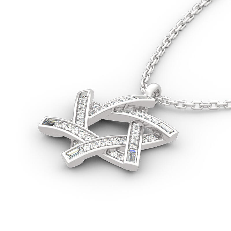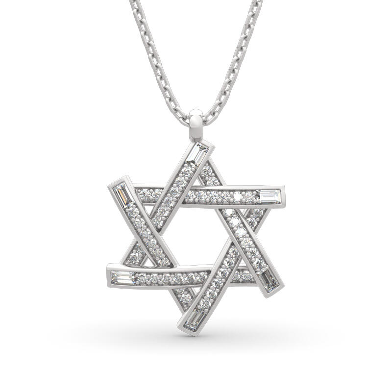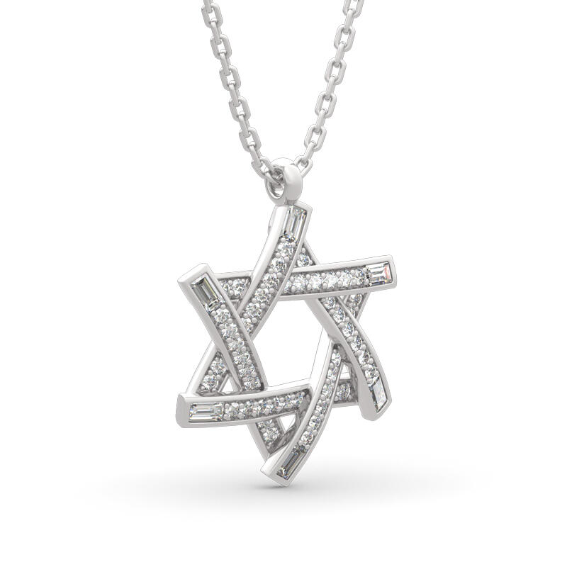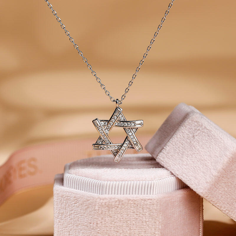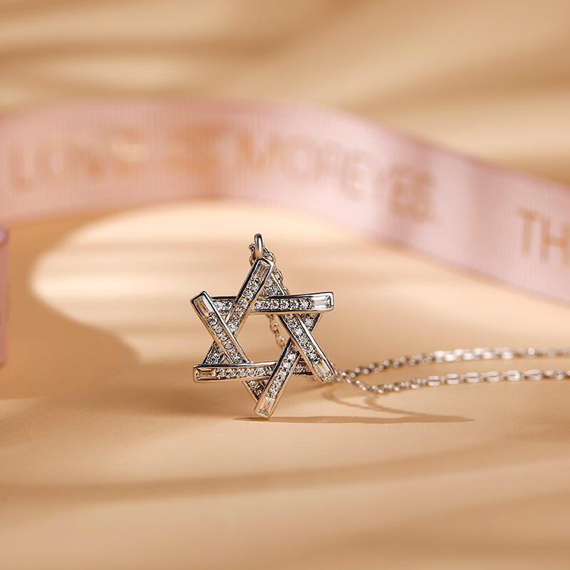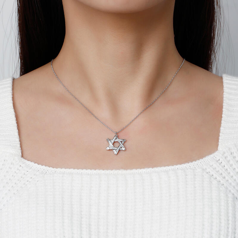 The star of David necklace symbolizes that God rules over the universe and protects us from all directions. A beautiful piece with beautiful meaning. This classic star of David pendant features brilliant stones details in sterling silver. All stones glisten with every beat of her heart. Celebrate your sweetheart with this necklace.