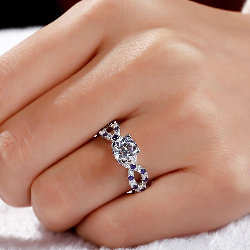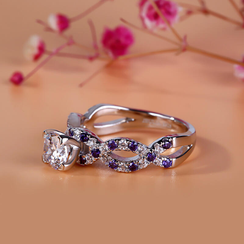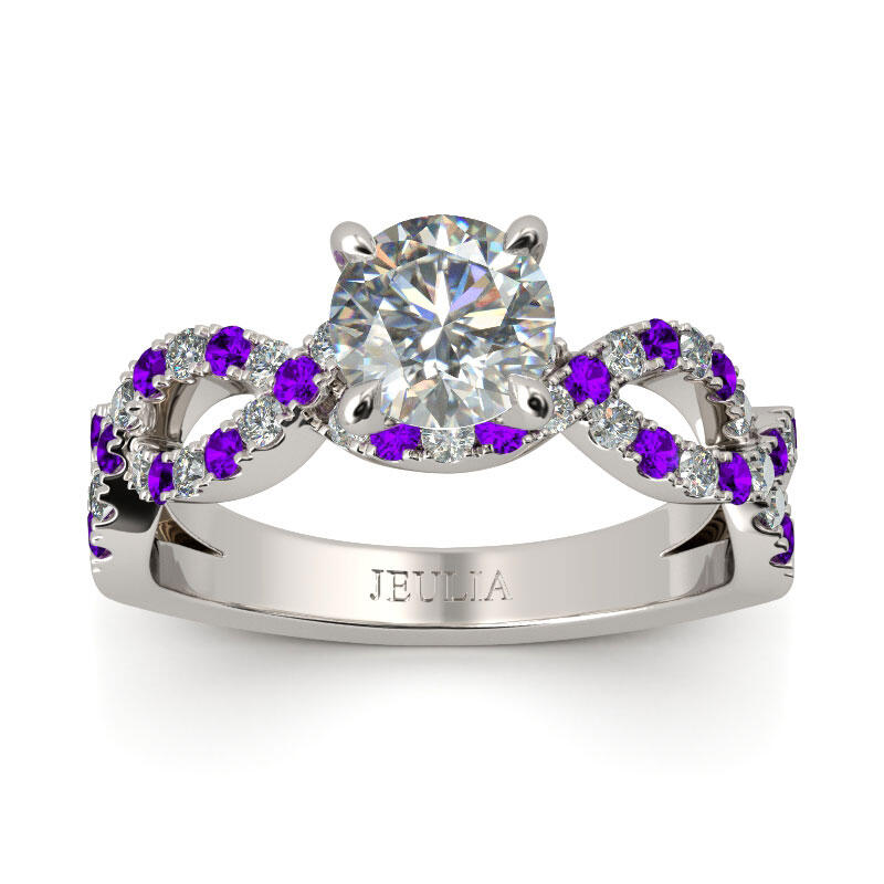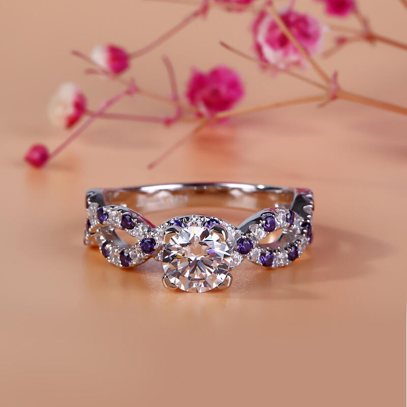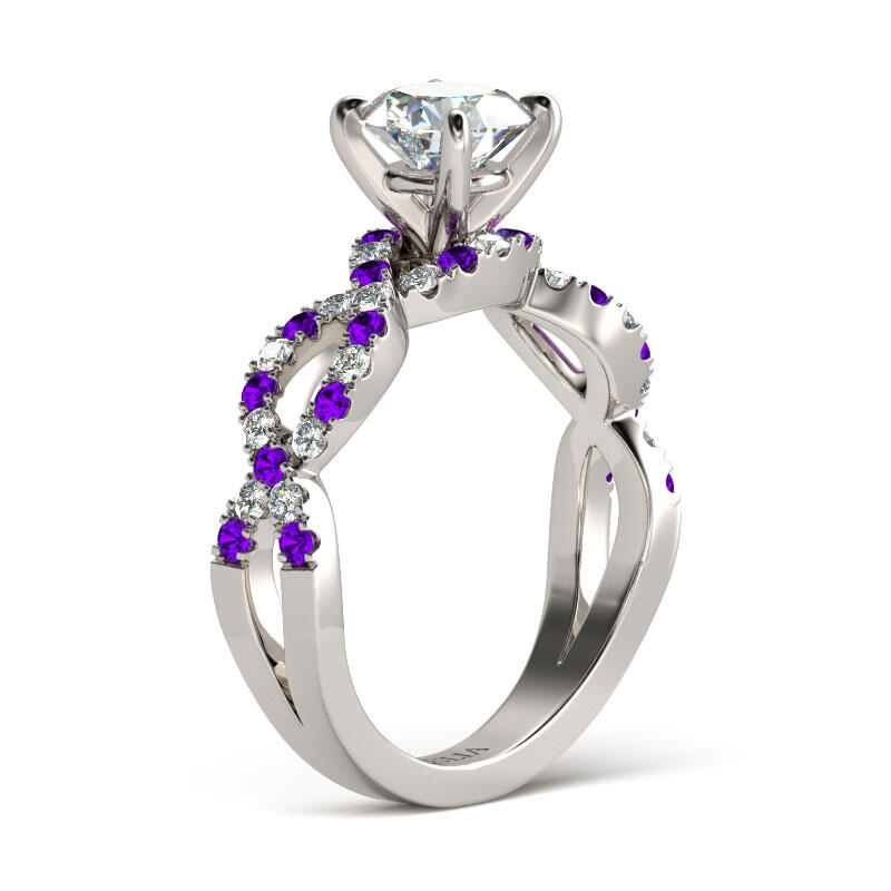 Seal your vows and celebrate your commitment with this stunning engagement ring. Beautifully crafted in sterling silver, this entrancing design features a round-cut stone at the center while amethyst stones and shimmering white stones alternately set on twisted shank. Designed to sparkle for a lifetime, this ring shine brightly enough to be deserving as a symbol of your love.