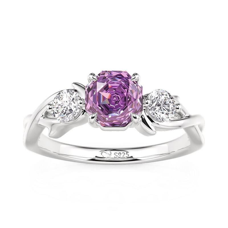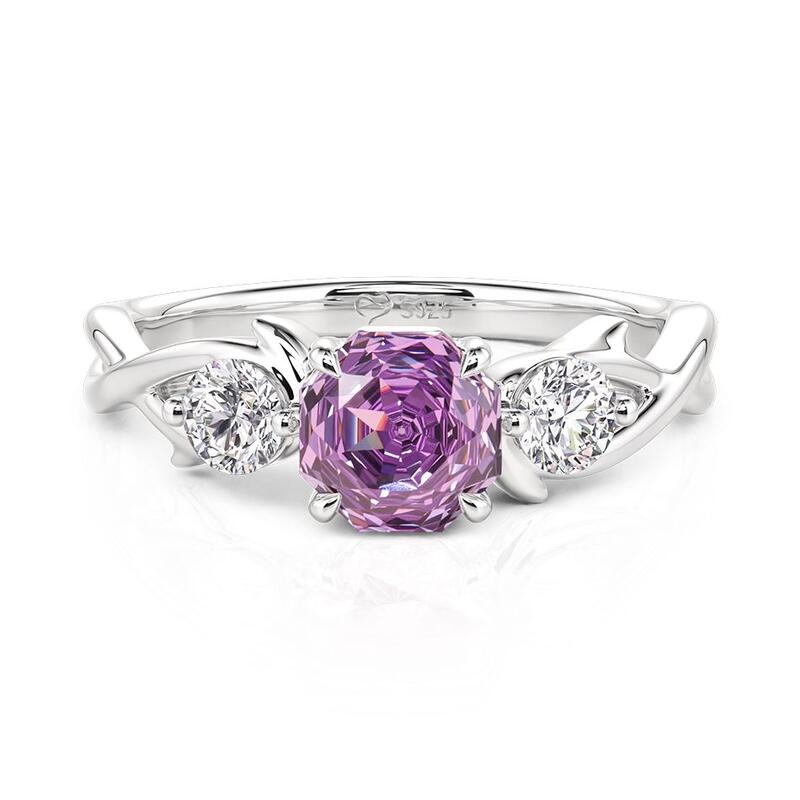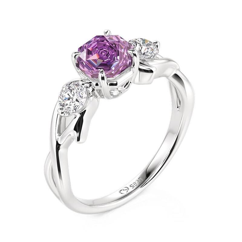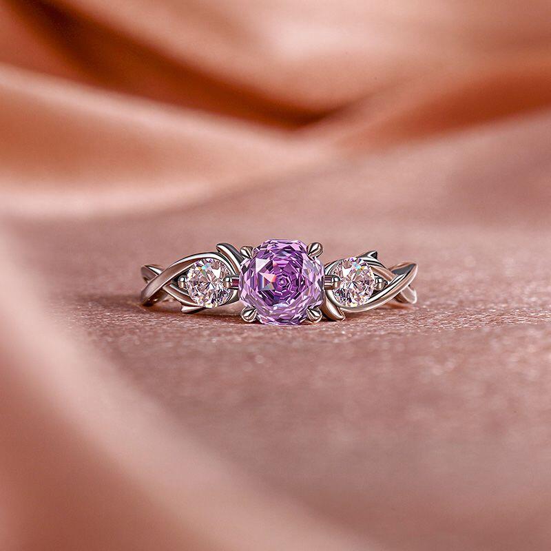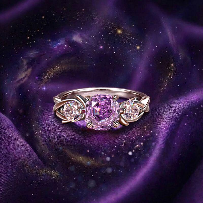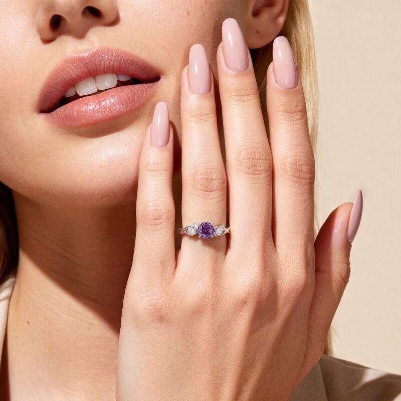 A rose-cut purple gem glows between two white stones, resting above a softly twisted band that adds gentle motion to classic elegance. Timeless yet tender, this Jeulia Twist Purple Three Stone Engagement Ring honors tradition while embracing a touch of poetic light.