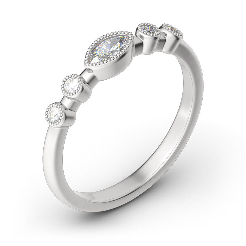 Simple and stunning, this stackable ring features a marquise cut stone at the center while four round stones adorn the shank. Milgrain detailing adds vintage elegance and completes the design. Whether you are looking for a daily go to accessory or that perfect piece for that special occasion, this is the ring for you. Perfect simply worn alone or as part of a ring stack, you may want to combine this item with something else from our Stackable Collection.