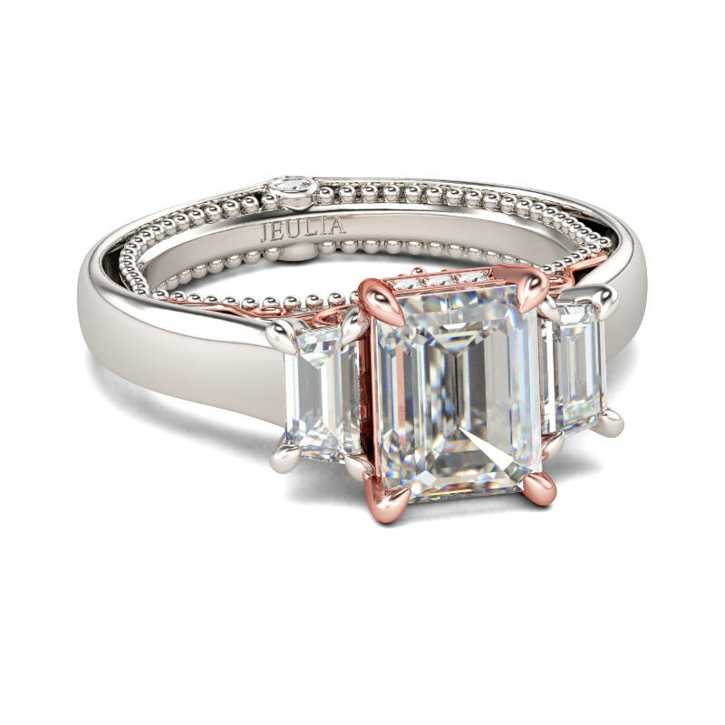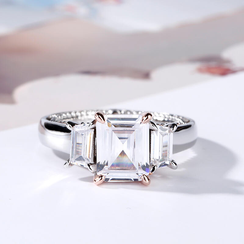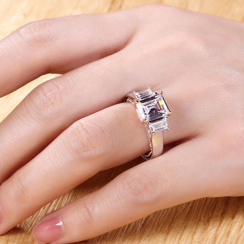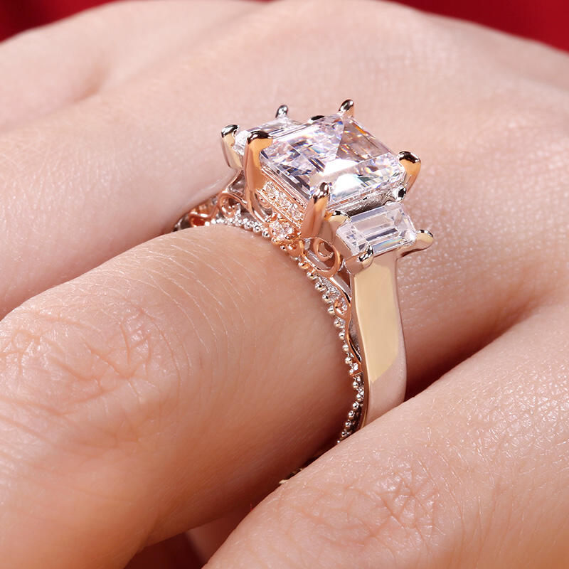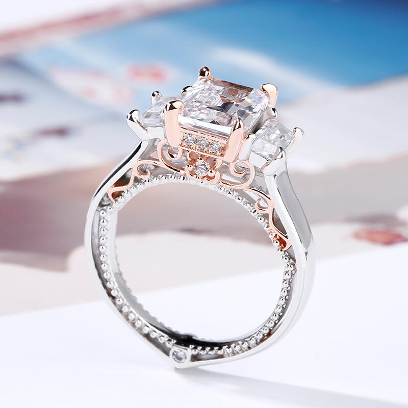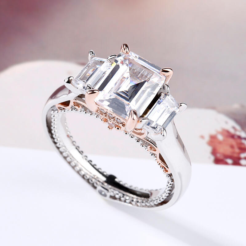 Luxurious and breathtaking, this engagement ring honors the light of your life. Crafted in two tone sterling silver, the ring features an emerald-cut center stone accented with two taper baguette-cut stones on a high polished shank. The shank is buffed to show a bright shine and elegant look. The delicate rose gold tone filigree details on the side of the ring adds elegance and vintage aesthetics to it. Surprised her with this masterpiece!